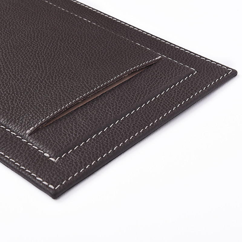 Βάση χειροποίητη με κορνίζα, για στερέωση φύλλων χαρτιού Α5 κατασκευασμένη από γνήσιο σπυρωτό καφέ δέρμα. Κατάλληλη για συνταγολόγιο ιατρού ή για να κρατάτε τις σημειώσεις σας πάνω σε μια φινετσάτη δερμάτινη βάση. Μπορείτε να το συνδυάσετε και με αλλά δερμάτινα αξεσουάρ γραφείου και να δημιουργήσετε ένα κομψό και ωραίο σετ γραφείου από δέρμα.