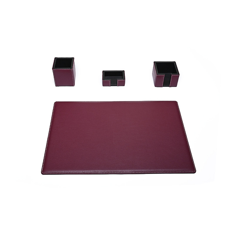 Σετ γραφείου χειροποίητο από γνήσιο σπυρωτό δέρμα σε μπορντό χρώμα. Αποτελείται από τέσσερα τεμάχια, ένα σουμέν σε διαστάσεις 60 x 40, μια μολυβοθήκη, μια καρτοθήκη και έναν κύβο σημειώσεων. Ανακαλύψτε αυτήν την υπέροχη σύνθεση από δερμάτινα αξεσουάρ, είναι ακριβώς αυτό που θα θέλατε για το γραφείο σας.