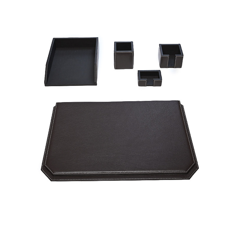 Σετ γραφείου, χειροποίητο από γνήσιο σπυρωτό δέρμα σε καφέ χρώμα. Αποτελείται από πέντε τεμάχια, ένα σουμέν με καπάκι για αποθήκευση εγγράφων σε διαστάσεις 60x40, έναν δίσκο εγγράφων Α4, μια μολυβοθήκη, μια καρτοθήκη και έναν κύβο σημειώσεων. Είναι κατασκευασμένο από τους έμπειρους τεχνίτες μας, από δέρμα υψηλής ποιότητας για να αποδώσει την απαιτούμενη πολυτέλεια στο γραφείο σας.