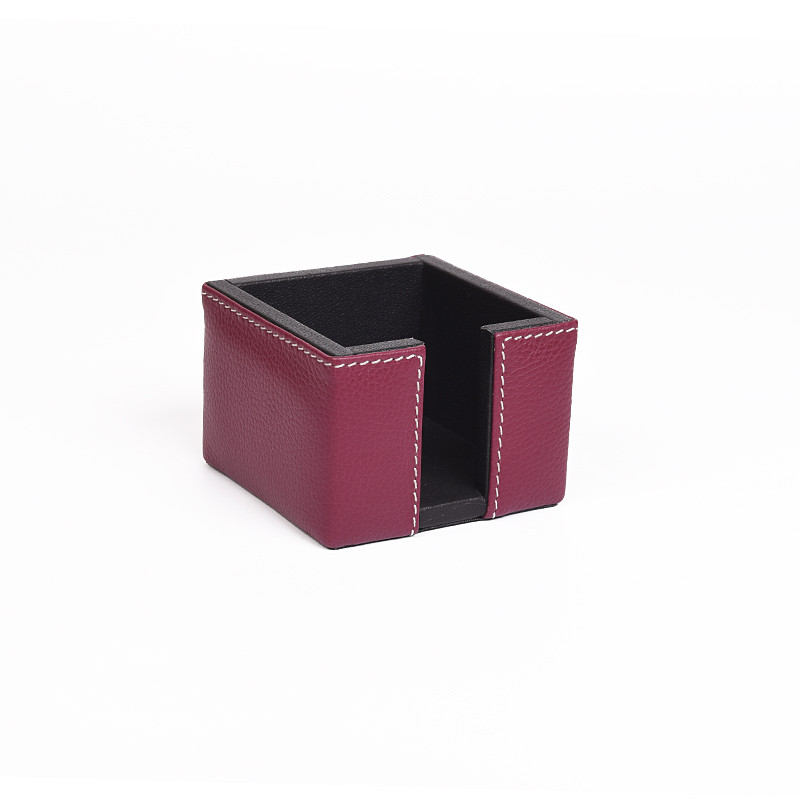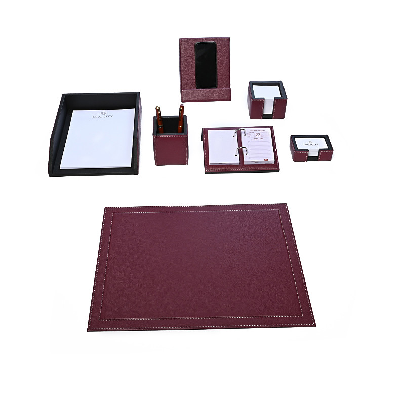 Σετ γραφείου, χειροποίητο σε μπορντό χρώμα. Αποτελείται από επτά τεμάχια, ένα σουμέν με διπλό διακοσμητικό γαζί σε διαστάσεις 50x39, έναν δίσκο εγγράφων Α4, μια μολυβοθήκη, μια καρτοθήκη, έναν κύβο σημειώσεων, ένα επιτραπέζιο ημερολόγιο και μια βάση κινητού τηλεφώνου ή ταμπλέτας. Η πολυτελής εμφάνιση που προσφέρει το γνήσιο δέρμα και η έμφαση στην τελειότητα που έχουν δώσει οι τεχνίτες μας είναι ακριβώς αυτό που θα θέλατε για την εικόνα του γραφείου σας.