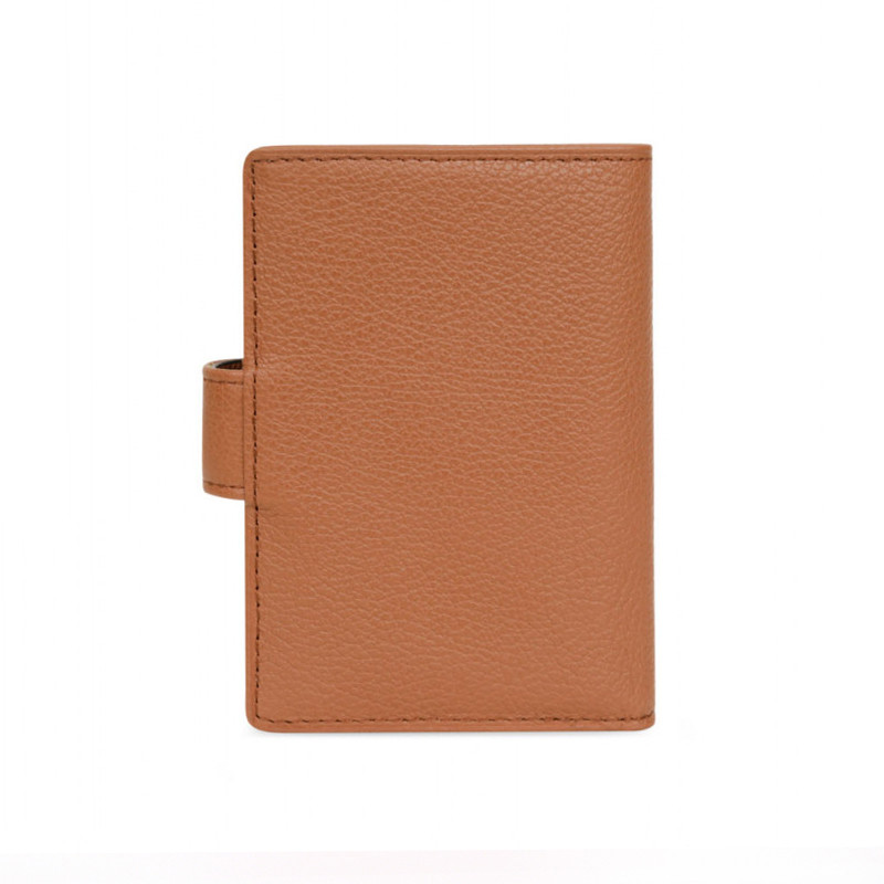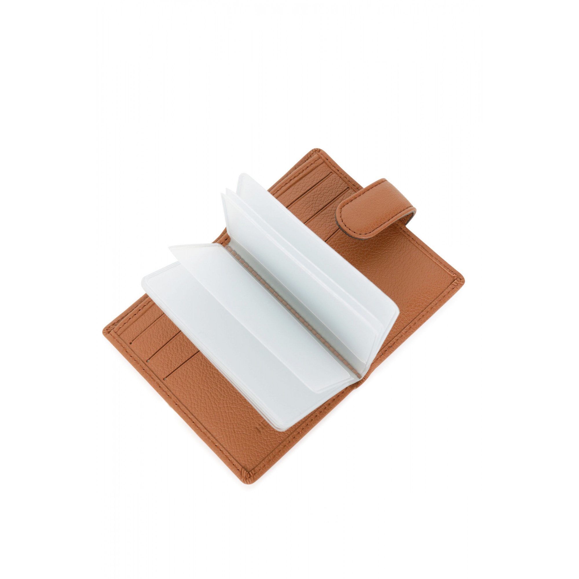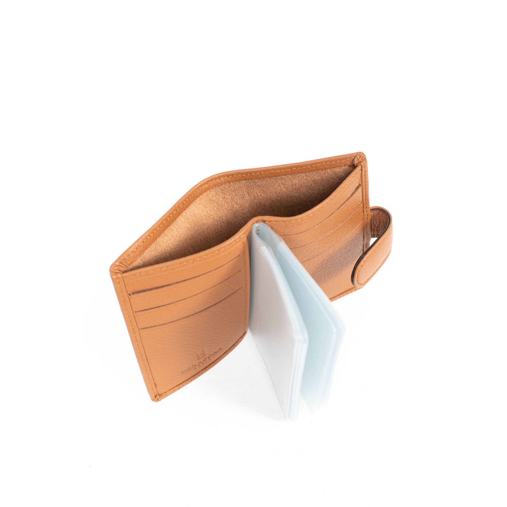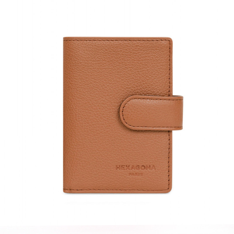 Θήκη καρτών με κούμπωμα της Γαλλικής εταιρείας Hexagona σέ ταμπά χρώμα. Μια μικρή θήκη κατασκευασμένη από δέρμα με θήκες για έξι κάρτες συν άλλες δώδεκα στις διαφάνειες και μια μικρή θήκη για χαρτονομίσματα.