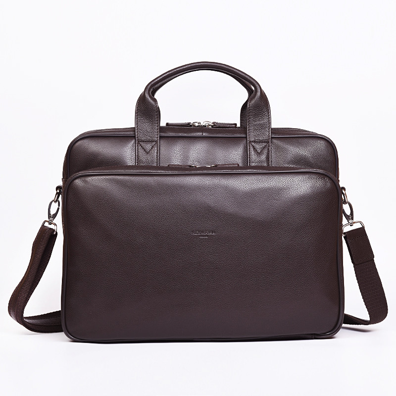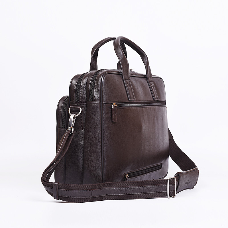 Χαρτοφύλακας A4 από γνήσιο δέρμα σε καφέ σκούρο χρώμα της Γαλλικής εταιρείας HEXAGONA. Διαθέτει τρείς χώρους κατάλληλους για φακέλους και έγγραφα Α4 με δυο μεγάλες τσέπες εσωτερικά και organizer για στυλό, κινητό, κάρτες, κλειδιά κ.α στον μικρότερο χώρο που βρίσκεται στο μπροστά μέρος. Εξωτερικά έχει μια πίσω τσέπη για αντικείμενα άμεσης πρόσβασης η οποία μετατρέπεται σε εξάρτημα για την μεταφορά με ασφάλεια σε βαλίτσα – τρόλεϊ. Διαθέτει κρεμαστό αποσπώμενο λουρί με αυξομειωτή για κράτημα στον ώμο.