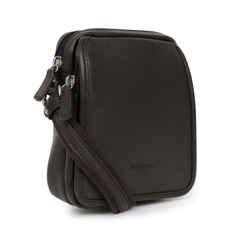 Ανδρικό τσαντάκι της Γαλλικής εταιρείας Hexagona. Κατασκευασμένο από ποιοτικό καφέ σκούρο δέρμα σε μικρό μέγεθος, αυτό το τσαντάκι αντανακλά μια εξαιρετική αισθητική και λειτουργικότητα. Το εσωτερικό του χώρου προσφέρει άνεση και οργάνωση για να ανταποκριθεί στις ανάγκες σας. Ο κύριος χώρος παρέχει επαρκή χωρητικότητα για τα απαραίτητα προσωπικά σας αντικείμενα, ενώ η εσωτερική τσέπη με φερμουάρ είναι ιδανική για την ασφαλή αποθήκευση αντικειμένων. Επίσης διαθέτει μια θήκη για κινητό τηλέφωνο. Διαθέτει μια εξωτερική τσέπη στο μπροστά μέρος που ασφαλίζει με φερμουάρ και καπάκι. Στο πίσω μέρος έχει μια ακόμη τσέπη για αντικείμενα που θέλετε να έχετε άμεση πρόσβαση. Το ρυθμιζόμενο λουρί προσφέρει επιπλέον ευελιξία, επιτρέποντάς σας να φορέσετε το τσαντάκι είτε χιαστί, είτε στον ώμο.