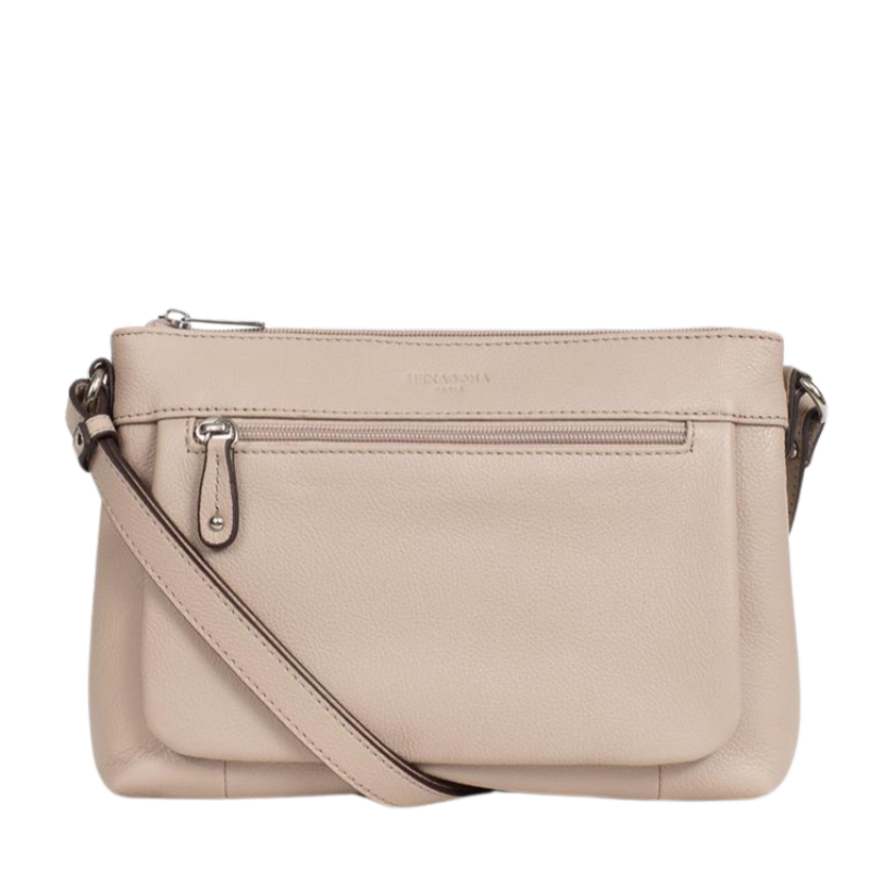 Τσάντα χιαστί από γνήσιο σπυρωτό μπέζ natural δέρμα της Γαλλικής εταιρείας HEXAGONA. Διαθέτει ένα κύριο χώρο με μια βοηθητική τσέπη εσωτερικά που κλείνει με φερμουάρ και θήκη για κινητό και άλλα μικροαντικείμενα. Εξωτερικά διαθέτει δύο τσέπες μια μεγάλη μπροστά και μια μικρότερη πίσω που ασφαλίζουν με φερμουάρ για να βάλετε αντικείμενα άμεσης πρόσβασης. Τέλος διαθέτει αυξομειούμενο λουρί από δέρμα για κράτημα στον ώμο ή για χιαστί.
