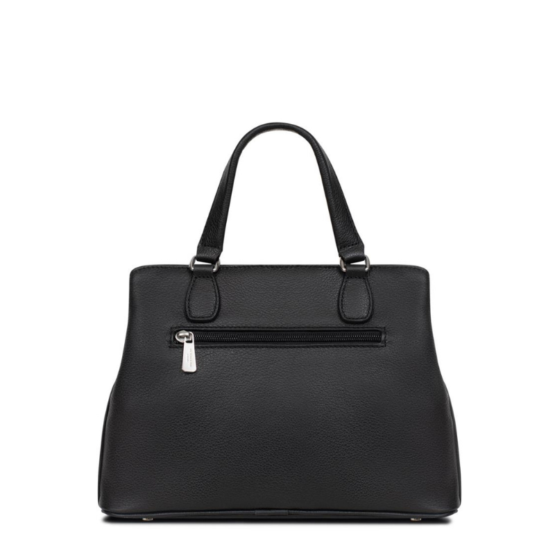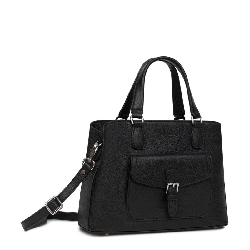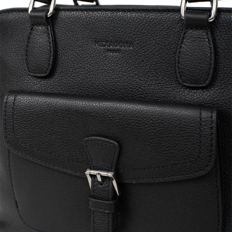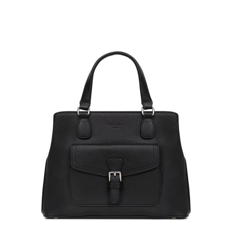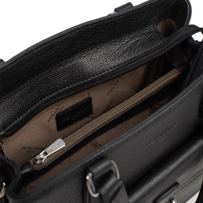 Κομψή και πρακτική τσάντα χειρός από γνήσιο δέρμα της Γαλλικής εταιρείας Hexagona σε μαύρο χρώμα. Ο εσωτερικός της χώρος είναι άνετος και λειτουργικός, με δύο ξεχωριστούς χώρους που χωρίζονται από μια ενδιάμεση τσέπη με φερμουάρ ιδανική για το πορτοφόλι σας. Διαθέτει επίσης μια μικρή τσέπη στο πίσω μέρος που κλείνει με φερμουάρ καθώς και θήκη για κινητό τηλέφωνο ή άλλα μικροαντικείμενα. Εξωτερικά, η τσάντα έχει μια μπροστινή τσέπη που ασφαλίζει με καπάκι και μία ακόμη στο πίσω μέρος με φερμουάρ, για γρήγορη πρόσβαση σε απαραίτητα αντικείμενα. Συνοδεύεται από μακρύ, ρυθμιζόμενο λουρί, που σας επιτρέπει να τη φοράτε άνετα στον ώμο ή χιαστί, ανάλογα με το στυλ και τις ανάγκες σας. Ένα διαχρονικό αξεσουάρ που συνδυάζει κομψότητα, ποιότητα και πρακτικότητα, ιδανικό για κάθε περίσταση.