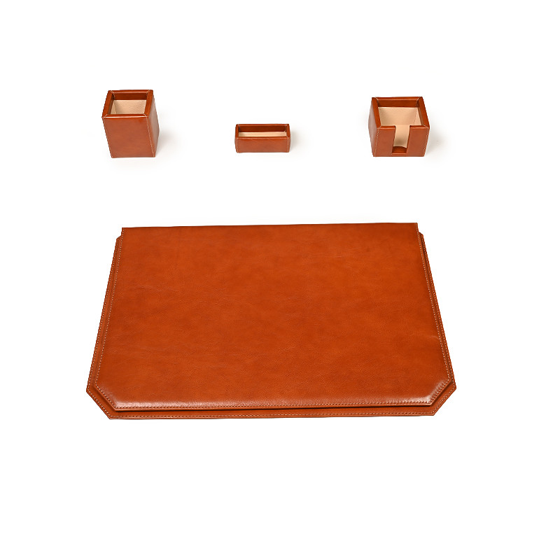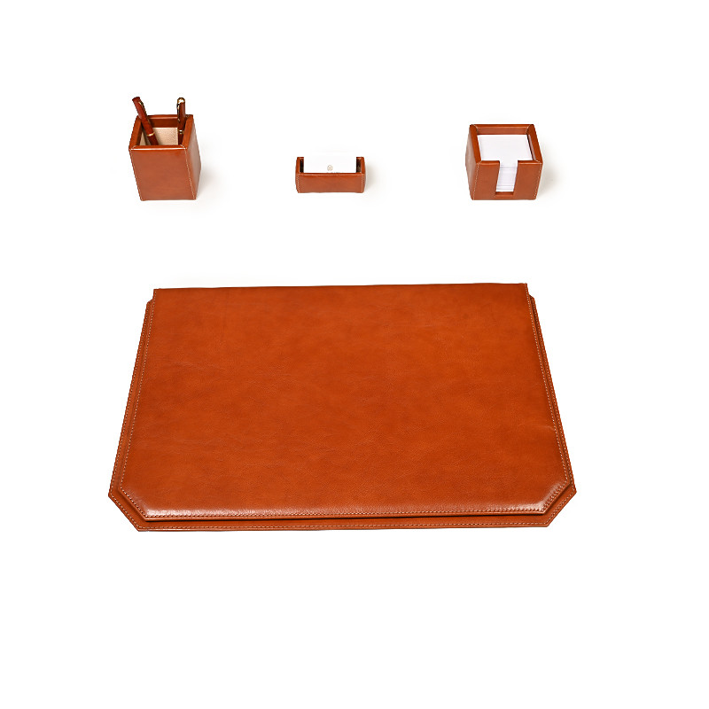 Εντυπωσιακό σετ γραφείου, χειροποίητο από γνήσιο φυτικό δέρμα υψηλής ποιότητας σε κομψό ταμπά χρώμα. Το σετ περιλαμβάνει τέσσερα κομμάτια: ένα πολυτελές σουμέν με καπάκι για αποθήκευση εγγράφων (60x40 cm), μολυβοθήκη, καρτοθήκη και κύβο σημειώσεων. Σχεδιασμένο με προσοχή στη λεπτομέρεια, συνδυάζει την πρακτικότητα με την αισθητική, προσθέτοντας μια αίσθηση κύρους και επαγγελματισμού σε κάθε γραφείο. Ιδανική επιλογή για απαιτητικούς επαγγελματίες ή ως εκλεπτυσμένο δώρο.