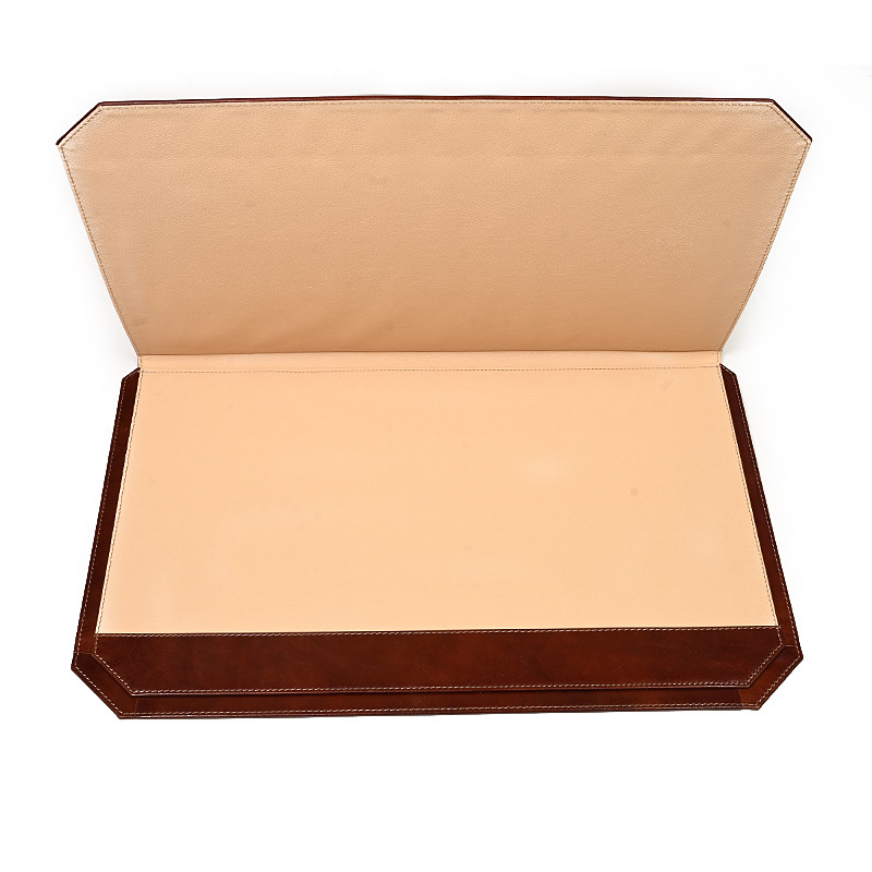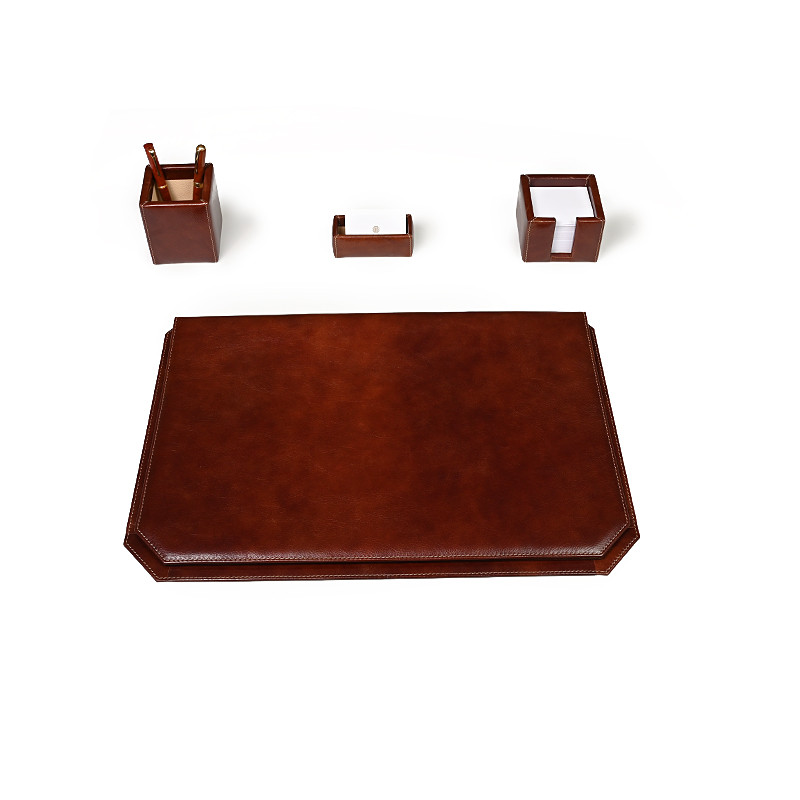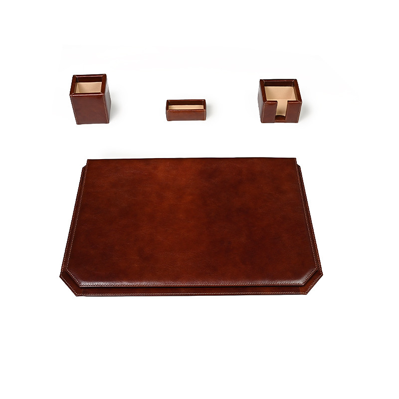 Εντυπωσιακό σετ γραφείου, χειροποίητο από γνήσιο φυτικό δέρμα υψηλής ποιότητας σε κομψό καφέ χρώμα. Το σετ περιλαμβάνει τέσσερα κομμάτια: ένα πολυτελές σουμέν με καπάκι για αποθήκευση εγγράφων (60x40 cm), μολυβοθήκη, καρτοθήκη και κύβο σημειώσεων. Σχεδιασμένο με προσοχή στη λεπτομέρεια, συνδυάζει την πρακτικότητα με την αισθητική, προσθέτοντας μια αίσθηση κύρους και επαγγελματισμού σε κάθε γραφείο. Ιδανική επιλογή για απαιτητικούς επαγγελματίες ή ως εκλεπτυσμένο δώρο.
