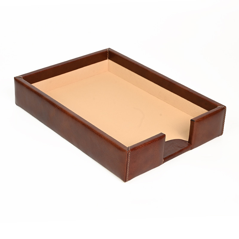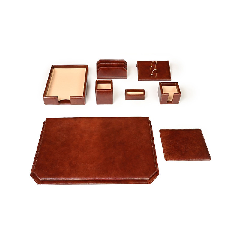 Αναβαθμίστε τον επαγγελματικό σας χώρο με αυτό το εξαιρετικό, χειροποίητο σετ γραφείου, σχεδιασμένο για να προσδώσει κομψότητα, οργάνωση και διαχρονική πολυτέλεια. Κατασκευασμένο από γνήσιο δέρμα φυτικής δέψης σε καφέ χρώμα, το σετ αυτό είναι μια δήλωση υψηλής ποιότητας και γούστου. Το σετ αποτελείται από 8 τεμάχια που καλύπτουν κάθε ανάγκη ενός κομψού και λειτουργικού γραφείου: ένα ευρύχωρο σουμέν (60x40 εκ.) με πρακτικό καπάκι αποθήκευσης για τα έγγραφά σας, μία μολυβοθήκη, μία καρτοθήκη, έναν κύβο σημειώσεων, έναν δίσκο για έγγραφα Α4, ένα mouse pad, έναν φακελοστάτη και ένα πρακτικό επιτραπέζιο ημερολόγιο. Αυτό το σετ είναι η ιδανική επιλογή για όσους αναζητούν ένα πολυτελές, υψηλής ποιότητας και πλήρως οργανωτικό σύνολο, όντας παράλληλα μια εξαιρετική πρόταση δώρου για επαγγελματίες.