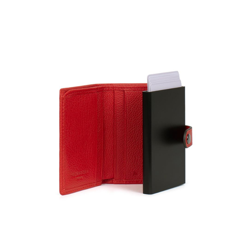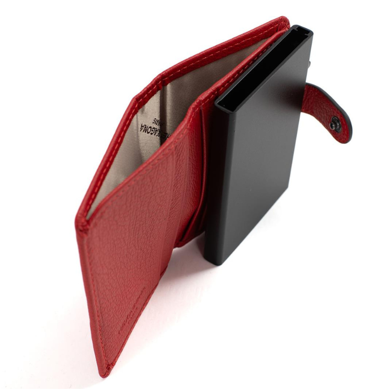 Μια κομψή και πρακτική καρτοθήκη κατασκευασμένη από την Γαλλική εταιρεία Hexagona από υψηλής ποιότητας δέρμα σε κόκκινο χρώμα, σχεδιασμένη για να συνδυάζει στυλ και λειτουργικότητα. Διαθέτει μηχανισμό Slide που χωρά έως 5 κάρτες, προσφέροντας εύκολη και άμεση πρόσβαση με ένα απλό πάτημα. Επιπλέον, η καρτοθήκη περιλαμβάνει 4 θήκες για κάρτες, καθώς και μια ευρύχωρη θήκη για χαρτονομίσματα.  Η ενσωματωμένη προστασία RFID εξασφαλίζει την ασφάλεια των καρτών σας από μη εξουσιοδοτημένη ασύρματη σάρωση. Με μοντέρνο σχεδιασμό, μικρό μέγεθος και υψηλή λειτουργικότητα, αποτελεί την ιδανική επιλογή για όσους αναζητούν έναν συνδυασμό πρακτικότητας, ασφάλειας και κομψότητας.