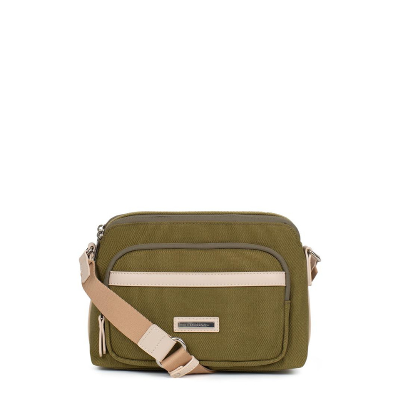 Κομψή και πρακτική γυναικεία τσάντα χιαστί της Γαλλικής εταιρείας Hexagona σε λαδί χρώμα, ιδανική για την καθημερινότητά σας. Είναι κατασκευασμένη από αδιάβροχο ύφασμα, προσφέροντας προστασία και στυλ σε κάθε σας εμφάνιση. Η τσάντα διαθέτει δύο κύριους χώρους, που σας επιτρέπουν να οργανώνετε εύκολα τα προσωπικά σας αντικείμενα. Στο εσωτερικό της θα βρείτε μία τσέπη με φερμουάρ για μεγαλύτερη ασφάλεια, καθώς και θήκη για το κινητό σας τηλέφωνο. Εξωτερικά διαθέτει τρεις πρακτικές τσέπες για άμεση πρόσβαση στα απαραίτητα, από τις οποίες οι δύο κλείνουν με φερμουάρ για μεγαλύτερη ασφάλεια. Το ρυθμιζόμενο λουρί προσφέρει άνεση και ευελιξία, επιτρέποντάς σας να τη φορέσετε είτε στον ώμο είτε χιαστί, ανάλογα με το στυλ και τις ανάγκες σας. Ιδανική επιλογή για καθημερινές εμφανίσεις, συνδυάζοντας λειτουργικότητα και κομψότητα.